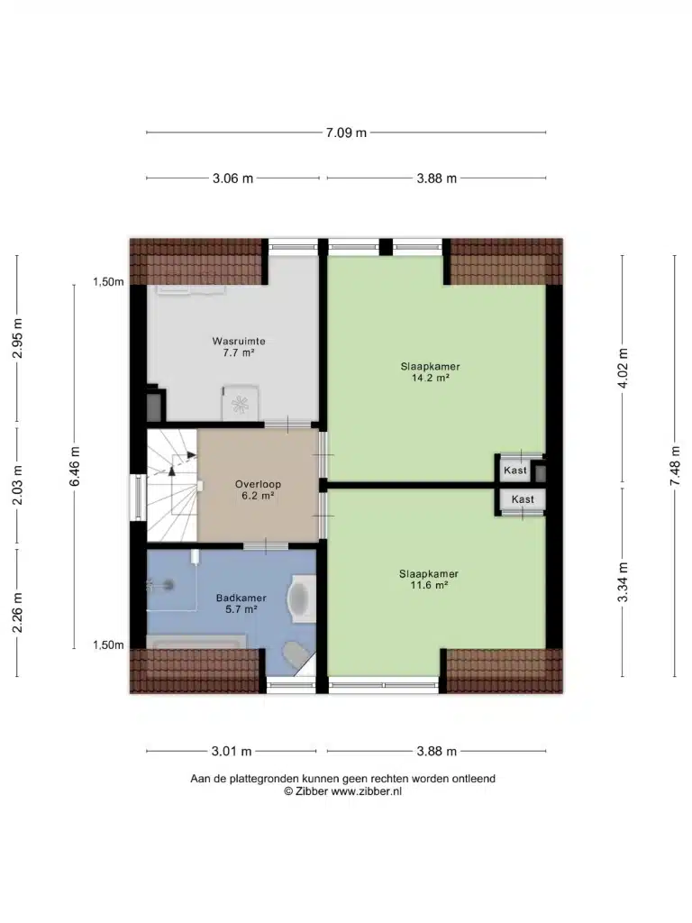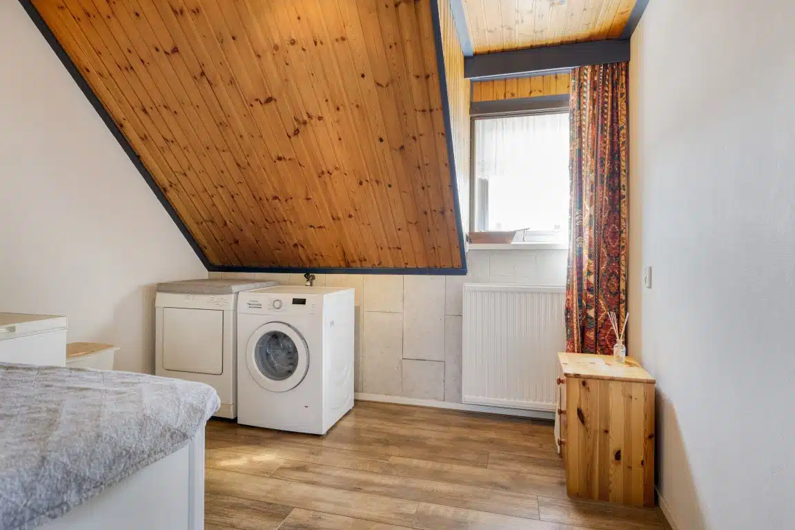 Deze verdieping heeft drie ruime slaapkamers. In een van de slaapkamers staat momenteel de opstelling van de wasmachine.