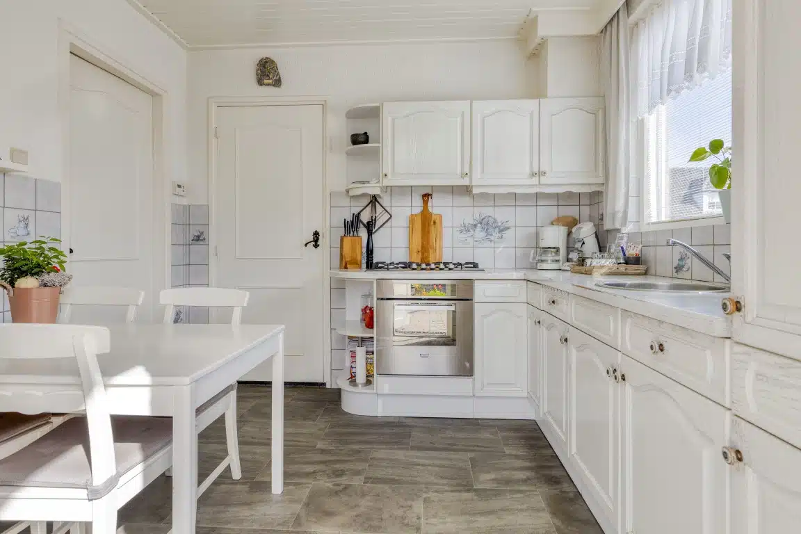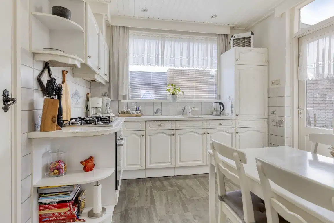 De keuken is uitgerust met een koelkast, gaskookplaat, afzuigkap en combi-oven. Vanuit de keuken loop je zo de tuin in.