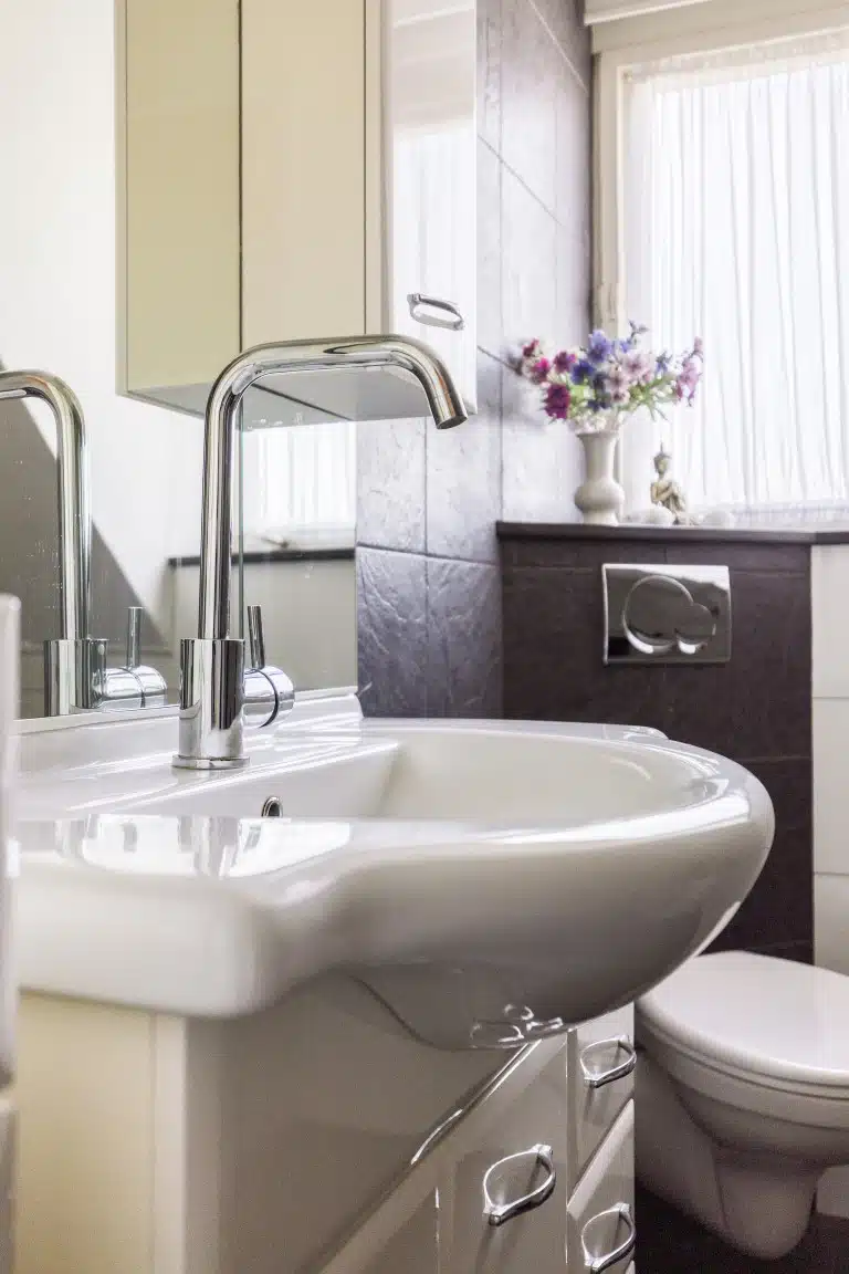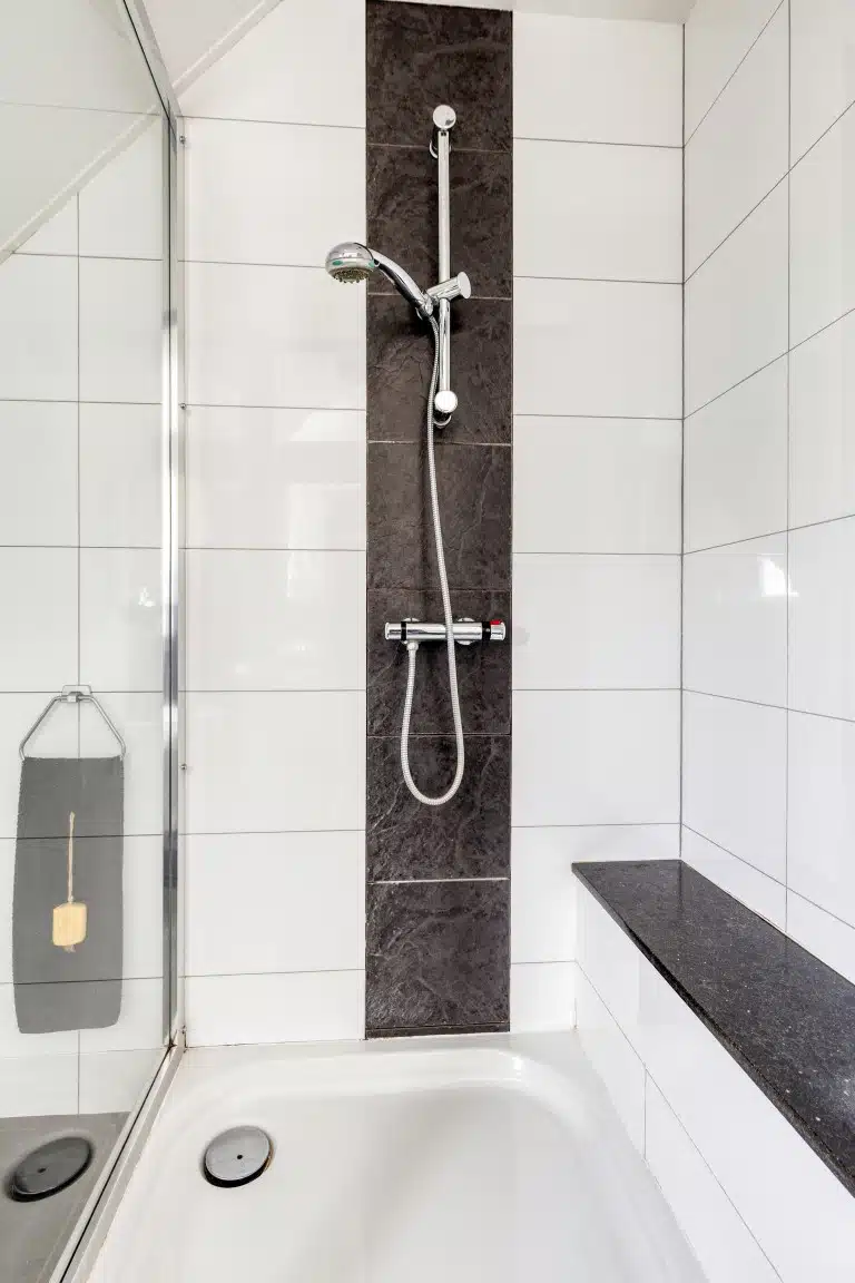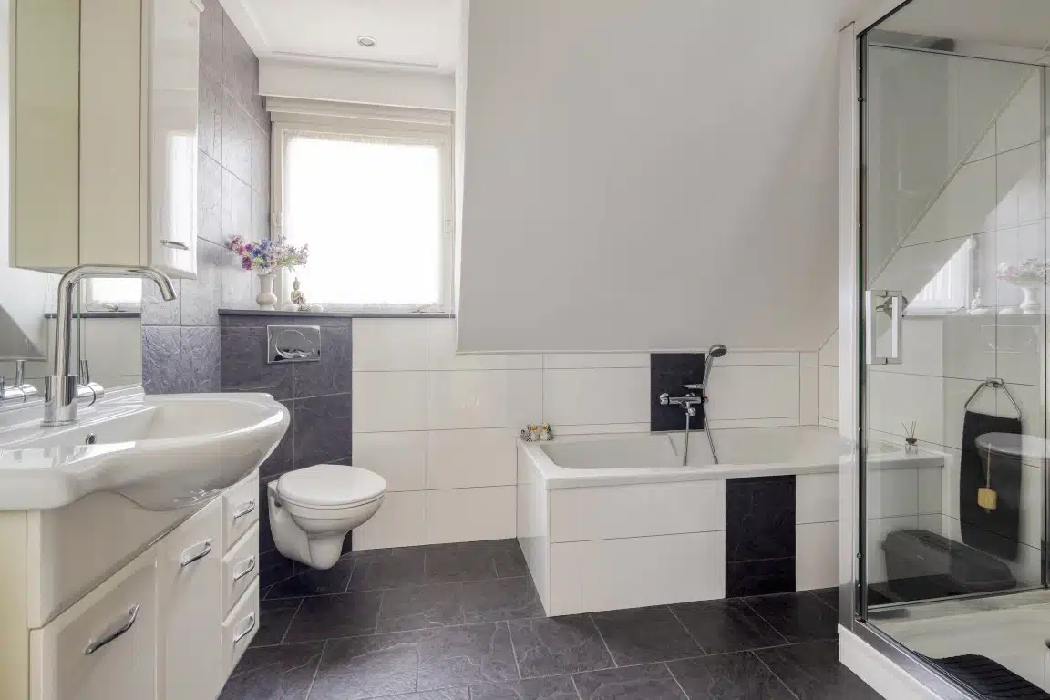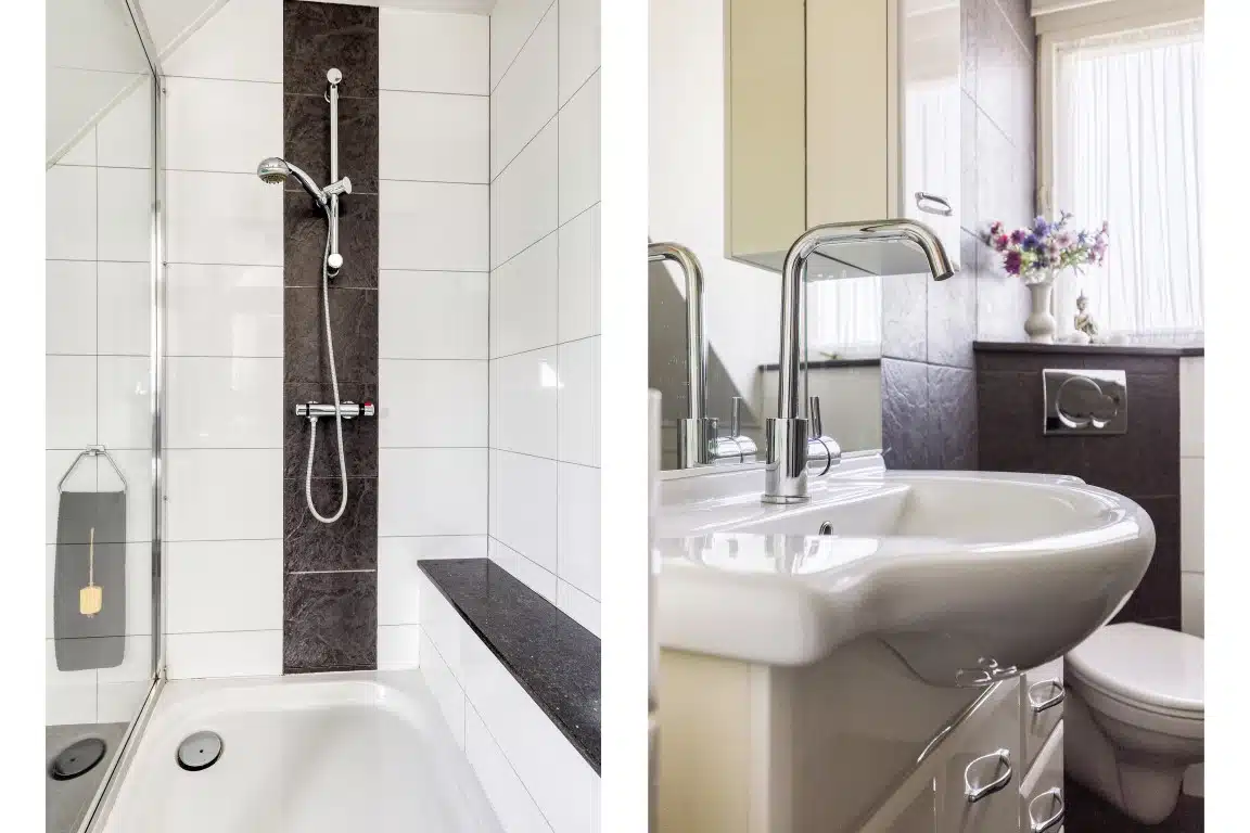 De badkamer is voorzien van een douche, ligbad, wastafel en toilet.