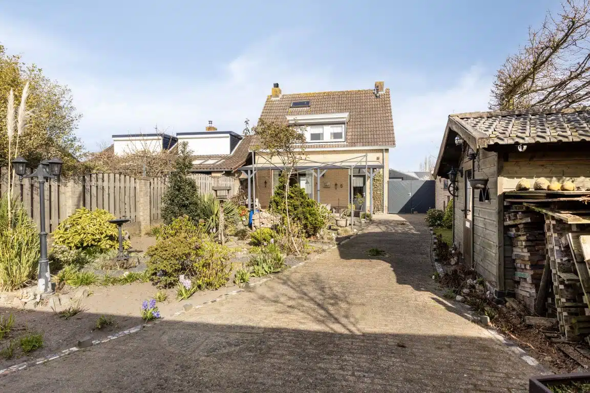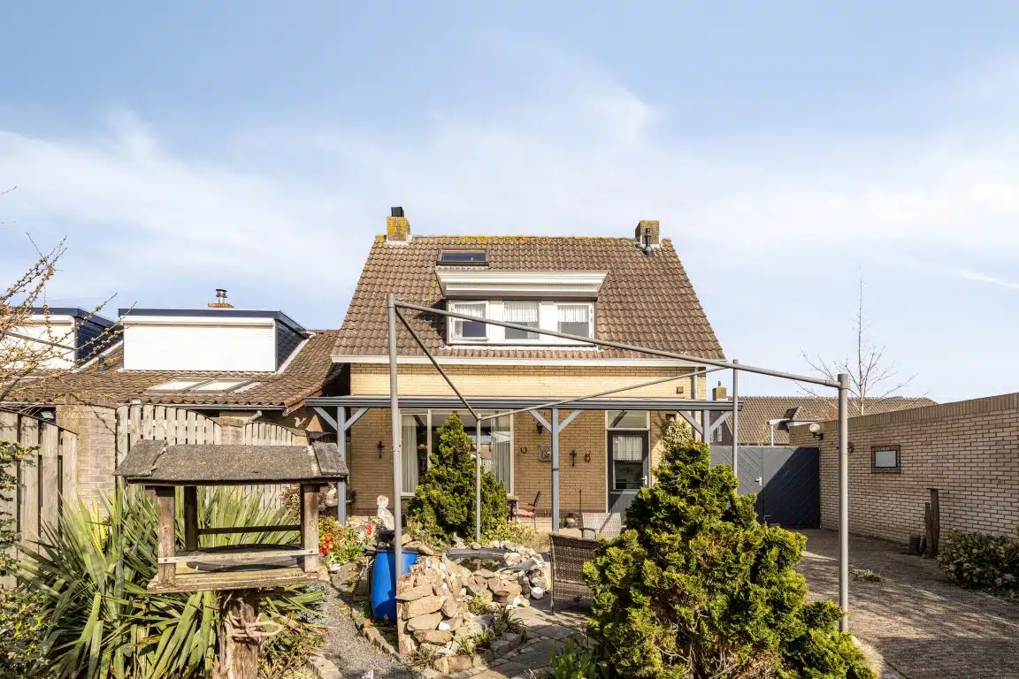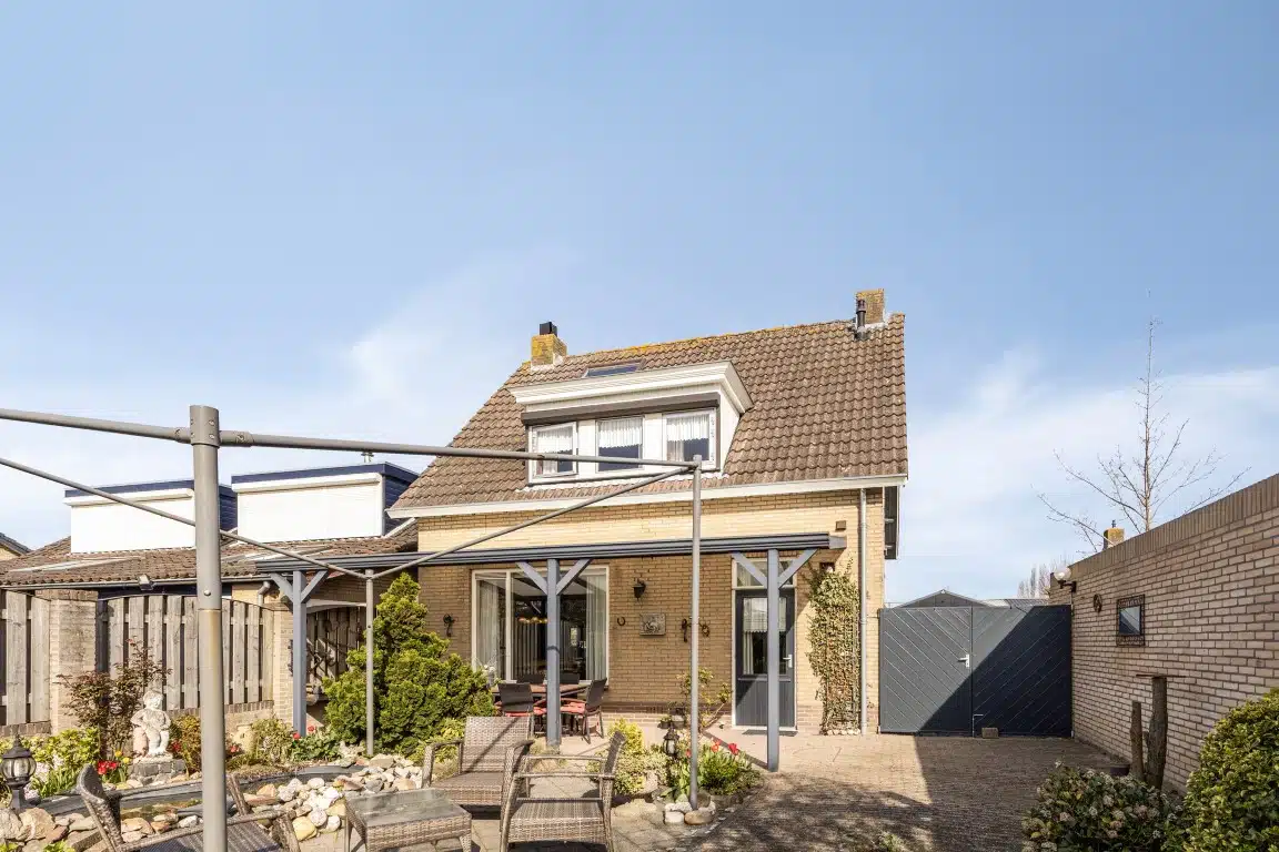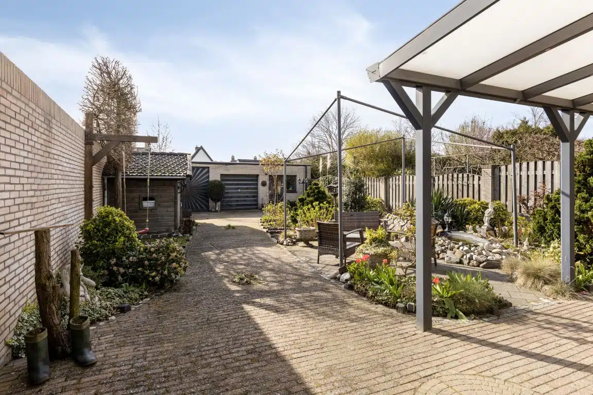 Aan de achterzijde van de woning is een fraaie overkapping gerealiseerd. De achtertuin ligt op het Westen en beschikt over de grote garage met een berging ernaast.