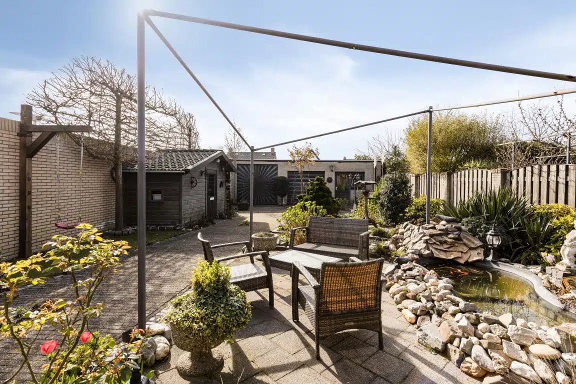 – Tuin op het Westen met een fraaie overkapping aan het huis;
