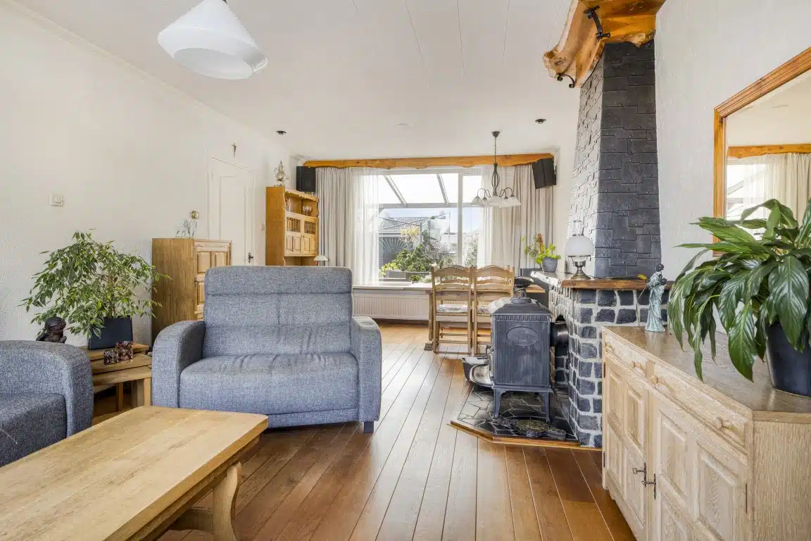 De woonkamer is een ruime doorzonwoonkamer met een prettige lichtinval. Er ligt een eikenhouten vloer en is er een houtkachel aanwezig.