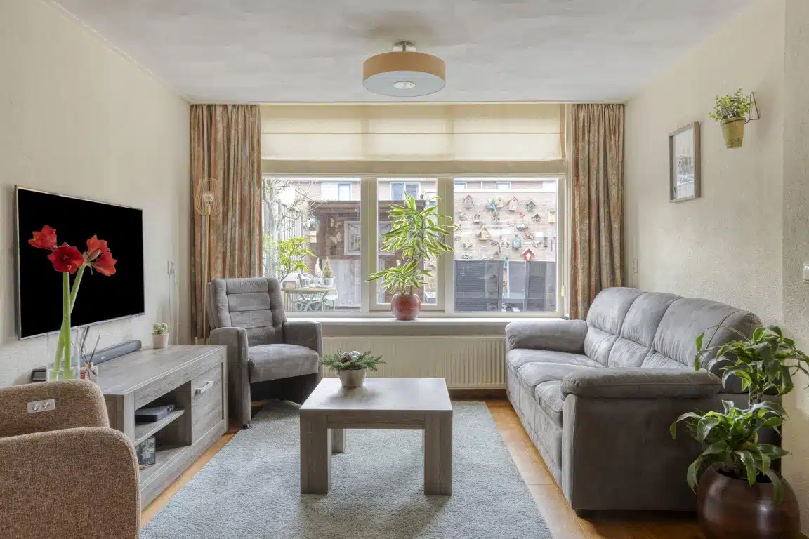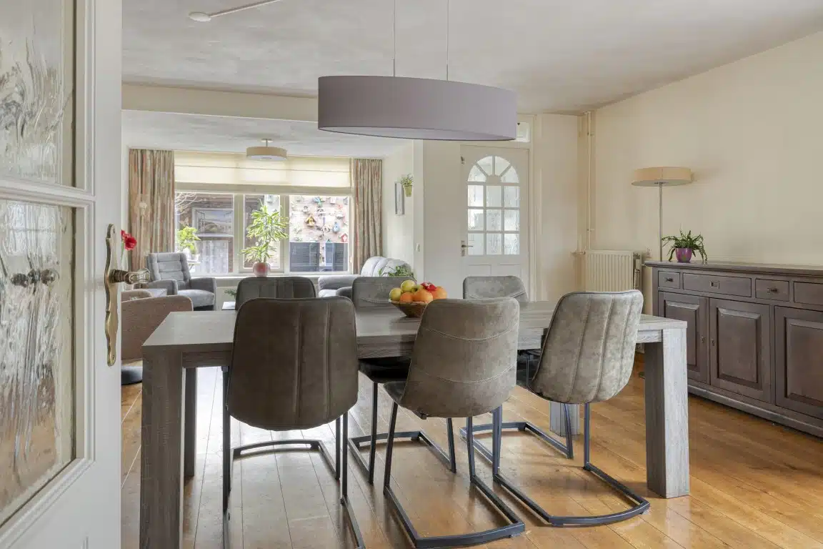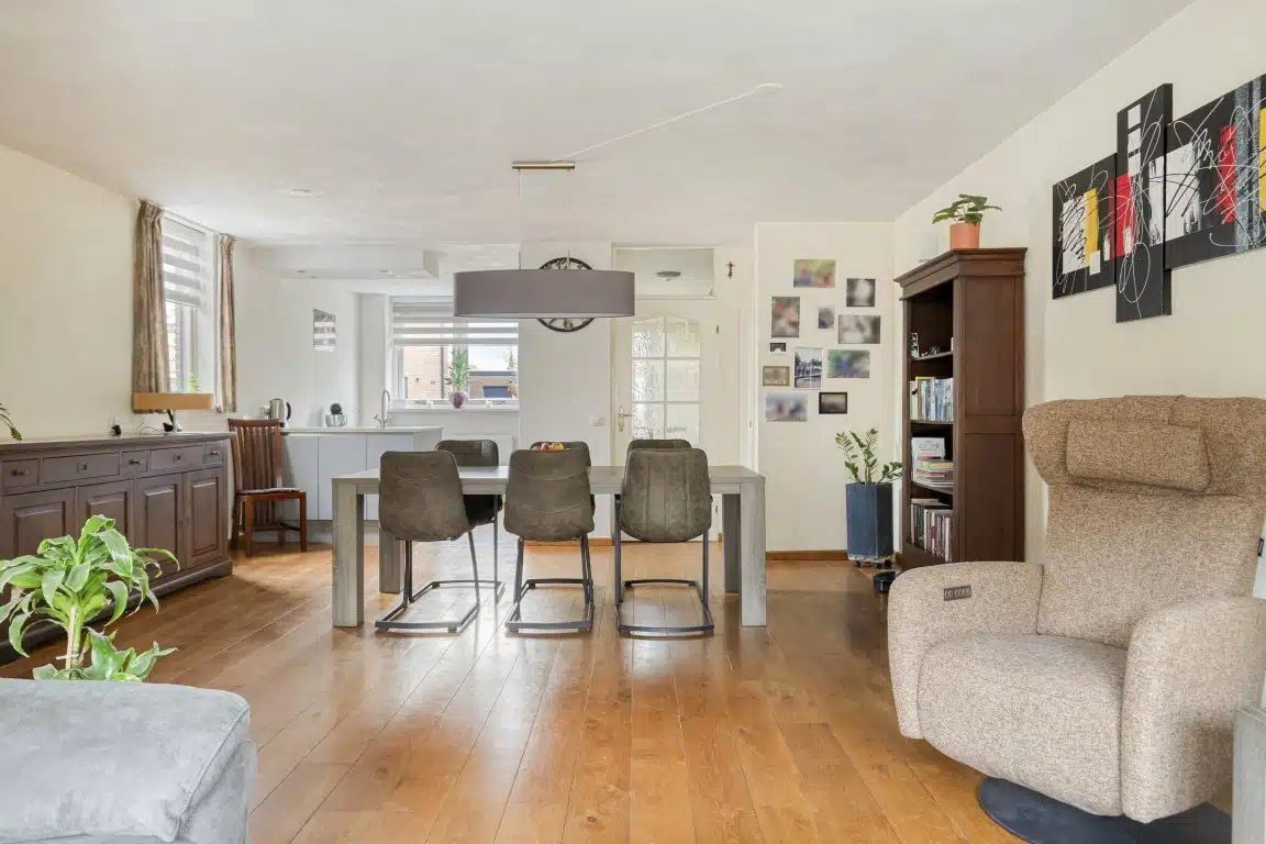 De woonkamer is gelegen aan de achterzijde van de woning. Vanuit hier kijk je uit op de achtertuin. Er ligt een fraaie eikenhouten vloer in.