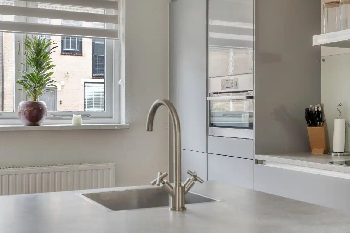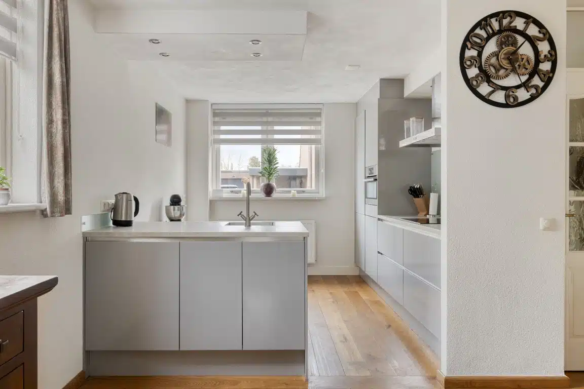 Aan de voorzijde is de keuken gelegen. Deze heeft een speelse opstelling en is voorzien van een koelkast, vriezer, vaatwasser, combimagnetron, inductiekookplaat en een afzuigkap.