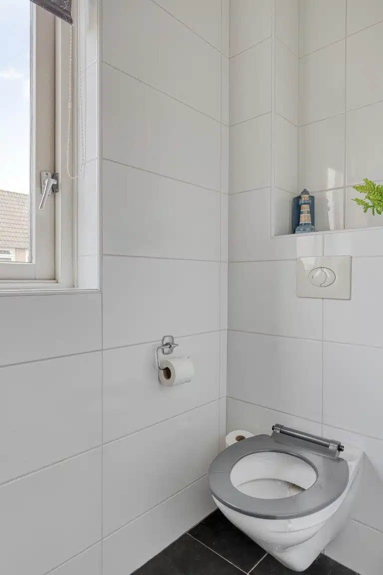 Het toilet is netjes afgewerkt met hangend sanitair en een wastafel.