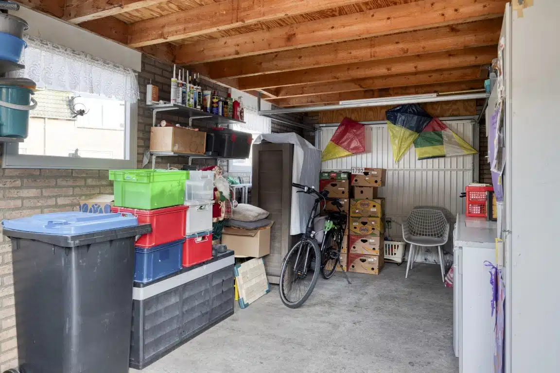 Aan de achterzijde is via de woonkamer de bijkeuken te bereiken. Hier bevindt zich de opstelling van de wasmachine en de droger. Vanuit hier kom je in de garage. Deze ruimte biedt volop mogelijkheden voor opslag of kan relatief eenvoudig worden omgevormd tot bijvoorbeeld een (extra) werk- of speelkamer.