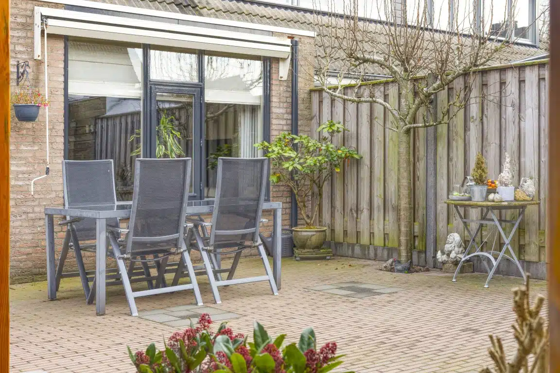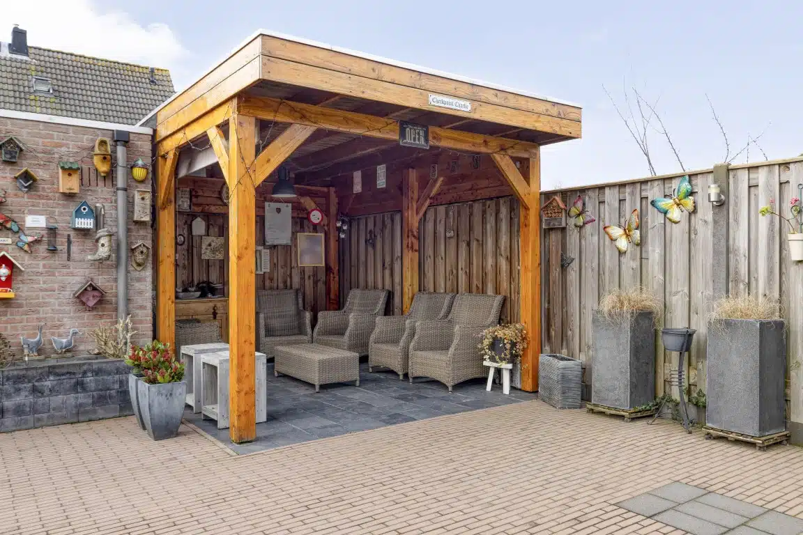 In de achtertuin is een losse vrijstaande berging met daaraan een gezellige overkapping gelegen. Het is een heerlijke onderhoudsvriendelijke tuin waar je al snel lekker buiten kunt zitten.