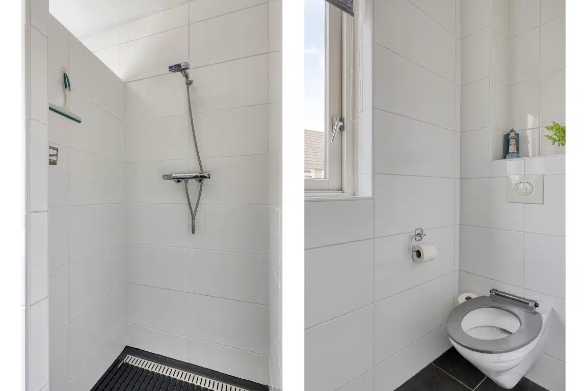 De badkamer is voorzien van een douchehoek, wastafel en toilet. Een fraaie lichte afwerking.