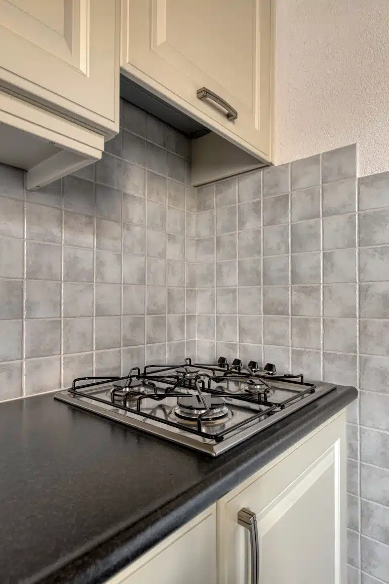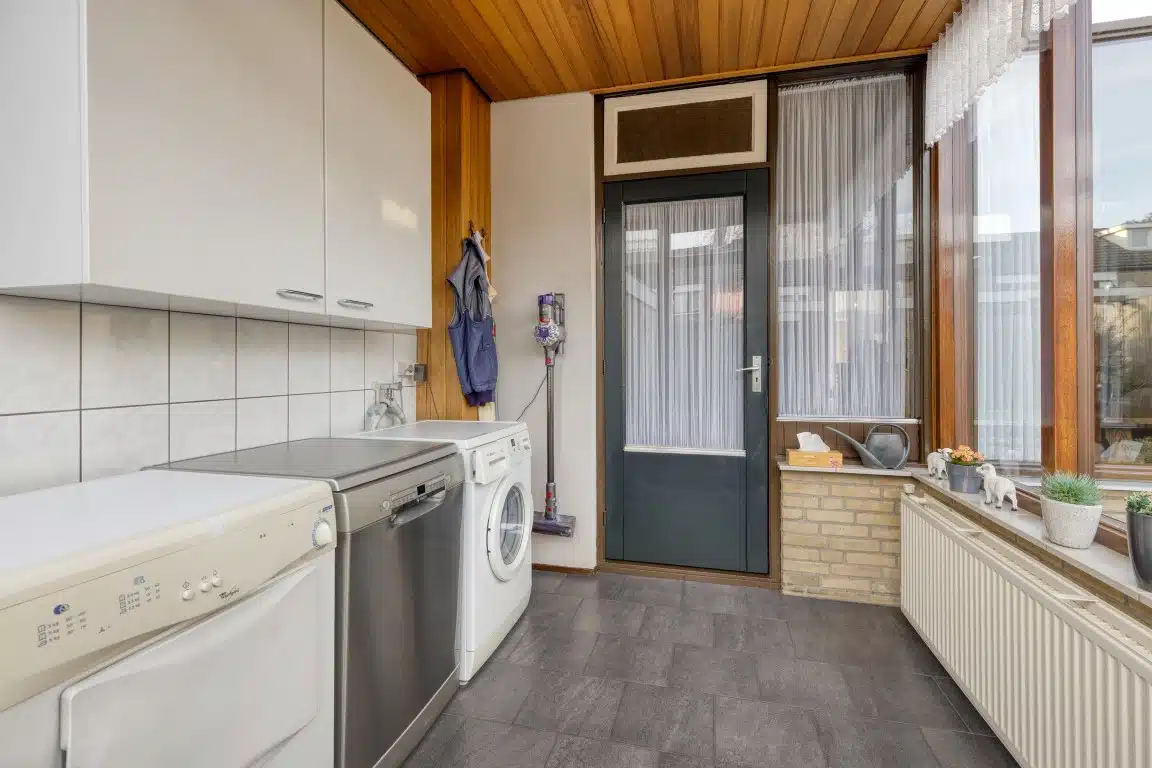 De keuken is uitgerust met een koelkast, gaskookplaat, afzuigkap en combi-oven. Aansluitend bevindt zich de bijkeuken met aansluitingen voor vaatwasser, wasmachine en droger.