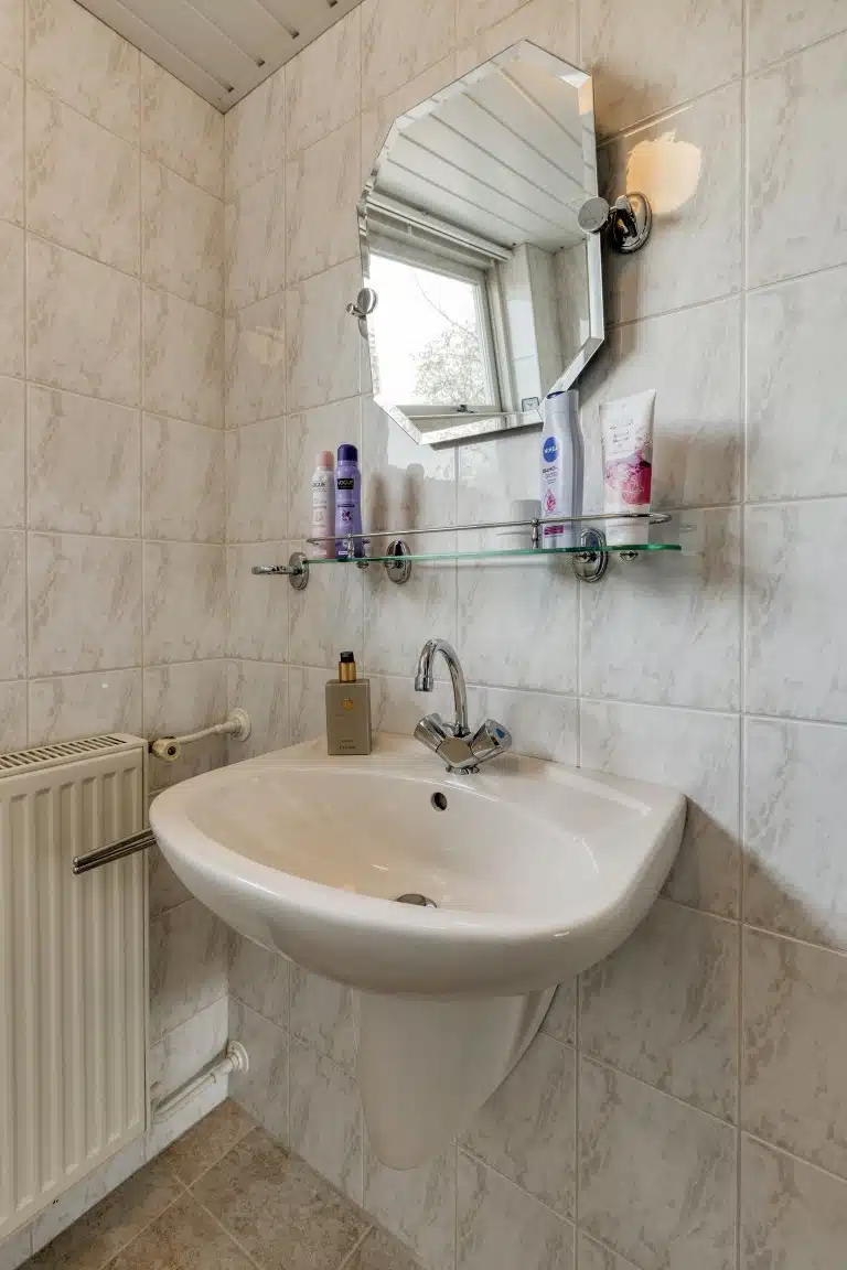 De badkamer is voorzien van een inloop douche, wastafel en toilet.