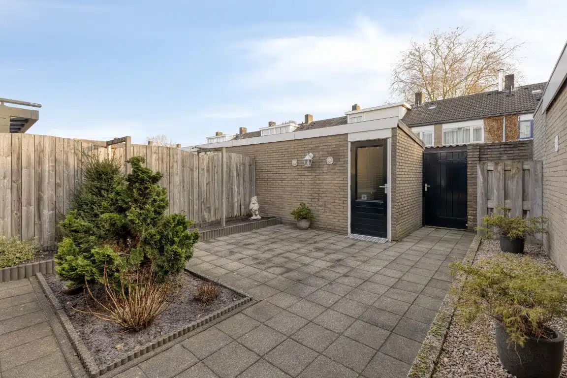 De achtertuin ligt op het oosten en beschikt over een berging en een eigen garagebox met elektrische roldeur.