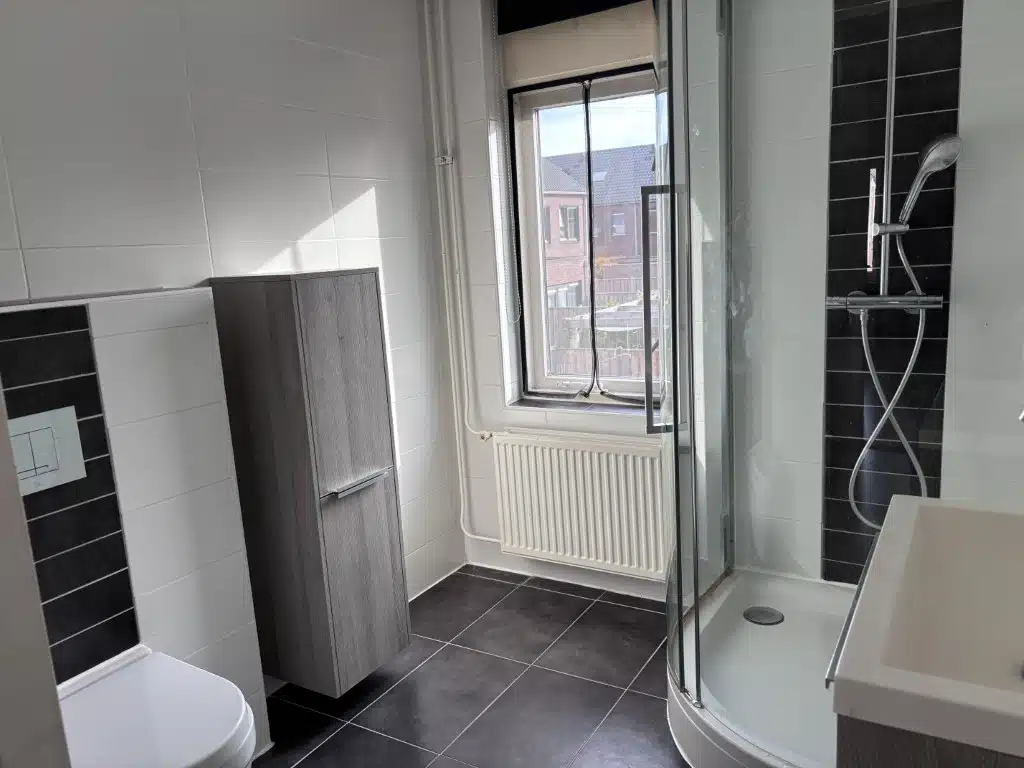 De badkamer is voorzien van een douchehoek, wastafel en toilet;