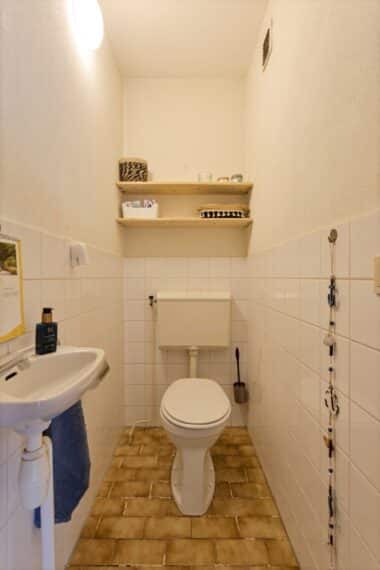 Het toilet is voorzien van hangend sanitair, fonteintje en het is half betegeld.